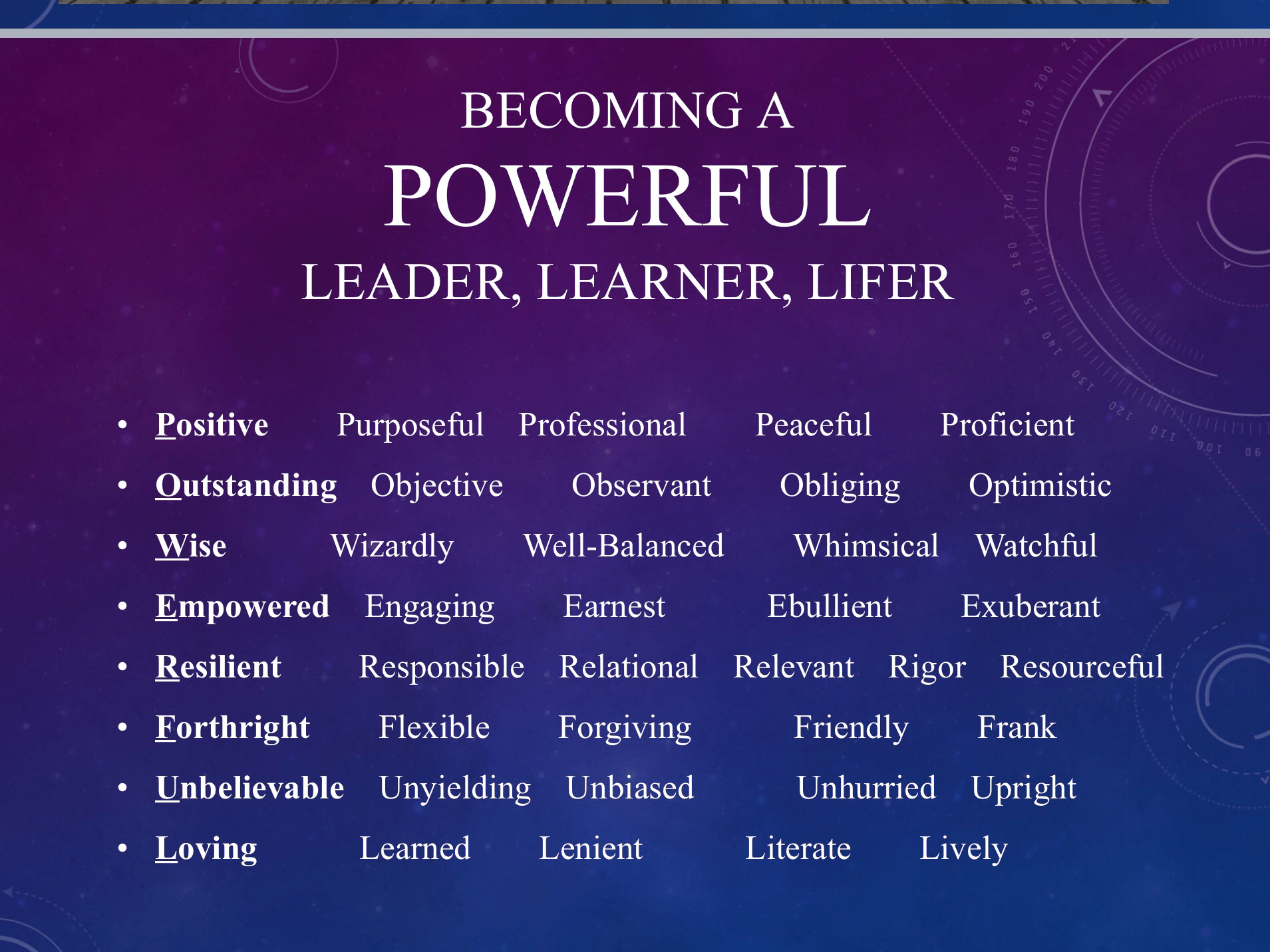 I bring this challenge to you to focus on the words that can support you on your journey. This challenge would be to take a look at the picture below that contains a number of words that I have dubbed #POWERFUL words, and to make some choices for yourself. Choose the words that reflect who you are as a #POWERFUL person. Maybe you are a #learner, a #leader, or a #lifer, like me, or maybe you are simply seeking to be a little better than the day before, or quite possibly you are seeking to change the world with your magical powers. I think that no matter which level your journey is on that you can choose to make it a #POWERFUL one by forcusing on the words that give you your internal power.